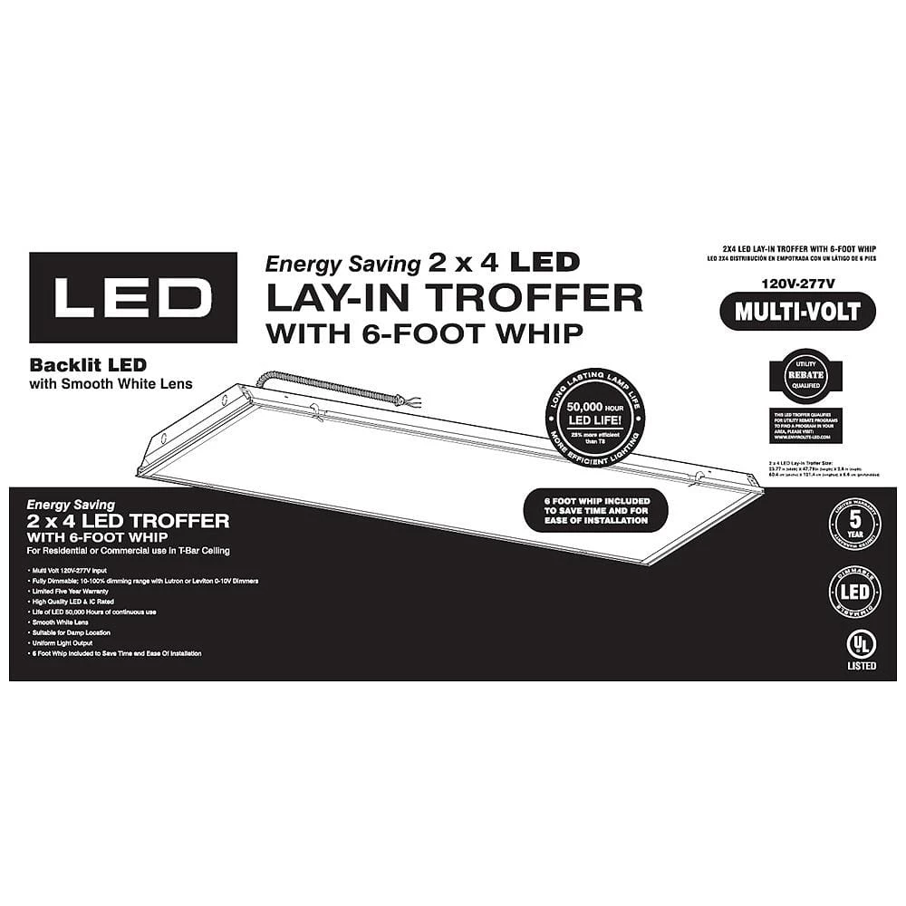 EnviroLite 2 ft. x 4 ft. LED troffers comes pre-wired with a 6 ft. whip, and they are the perfect solution for grid ceiling lighting needs. These commercial light fixtures are designed to save energy and lower maintenance costs. The integrated LED light source inside uses 33% less power to produce the same amount of light as fluorescent ceiling fixtures. The LED light source is built into the troffer so you don’t have to replace light bulbs ever. Because it’s LED, you will never hear the hum that fluorescent light fixtures make. This commercial lighting troffer uses only 45-Watt to provide 4000 Lumens of bright white 4000K CCT light. The sturdy frame is easy to handle and installs directly into a grid ceiling using the built-in T-bar clips. The white lens sits flush to the ceiling and distributes the light evenly. EnviroLite commercial lighting troffers are built to last for 50,000 hours and come with a 5-year warranty. They are UL listed and IC rated for contact with insulation and can be installed in damp locations. They accept 120/277-Volt input and are fully dimmable using a 0-10-Volt dimmer. These troffers are DLC listed to qualify for commercial lighting rebates and special incentives in certain areas.