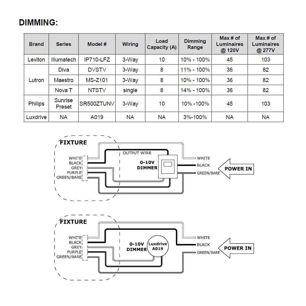 - 10% to 100% dimming range with Lutron or Leviton 0-Volt to 10-Volt dimmers