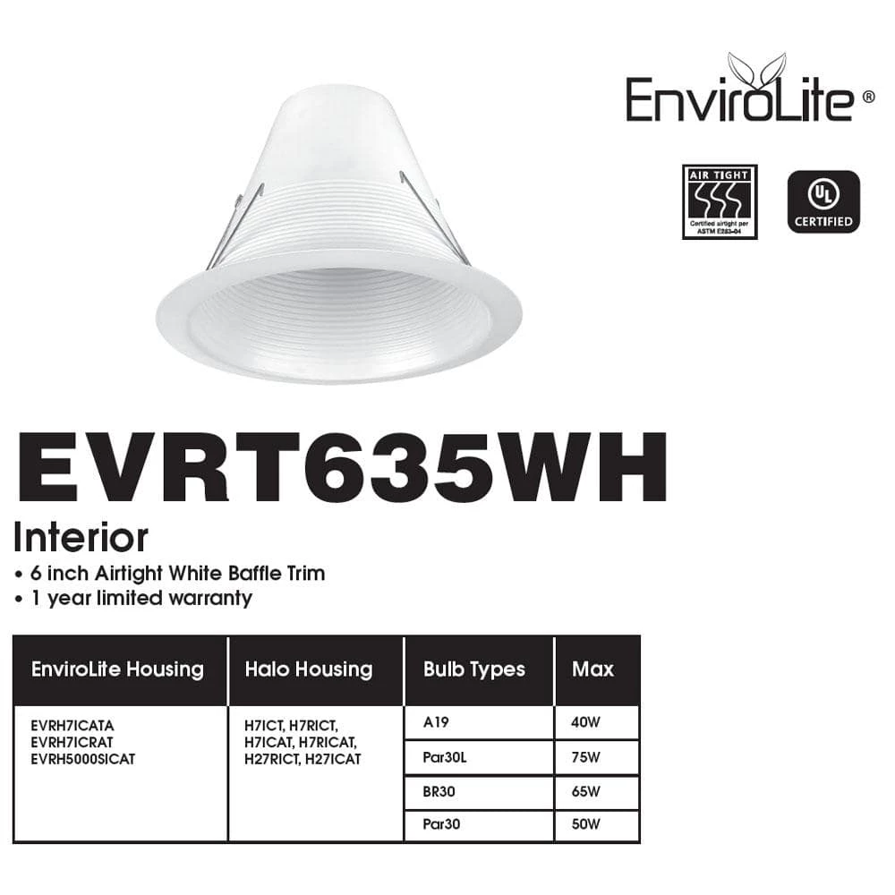 This EnviroLite 6 in. White Airtight Baffle Trim 6-Pack creates an seamless finished look on ceiling. 1-piece cone baffle design reduces heating and cooling costs by minimizing the amount of air flowing through the fixture. It can be used with both insulated ceiling housings and with non-insulated ceiling housings.