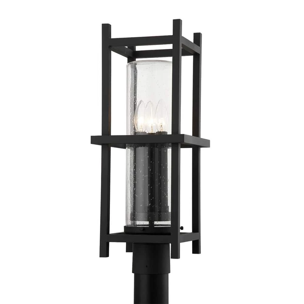 Inspired by prairie and craftsman homes, Carlo adds a timeless elegance to any style home. Classic candelabra bulbs are on display inside a clear seeded glass tube then encased within a textured black metal frame. Sconce and post fixture are for indoor and outdoor use.