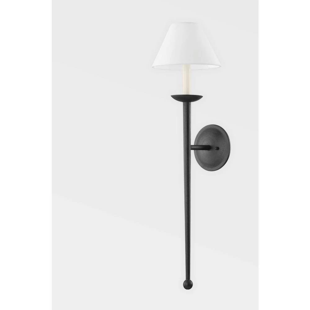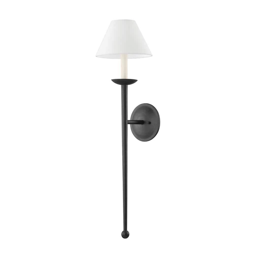 Inspired by traditional design, London makes a statement yet is still understated. Long, straight arms extend downward to round finials on 1 end and support a distinctly shaped white linen shade at the other. The forged iron finish is unexpected and works beautifully with this crisp, comfortable design.