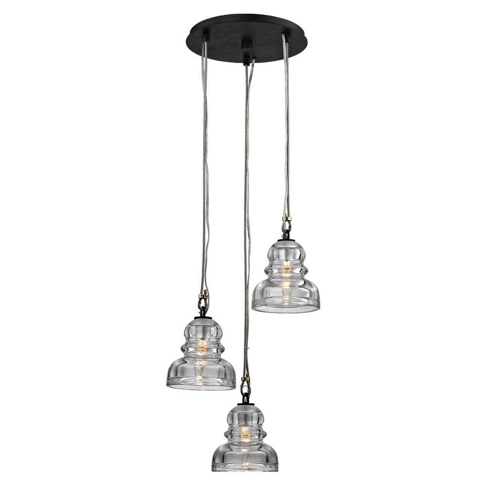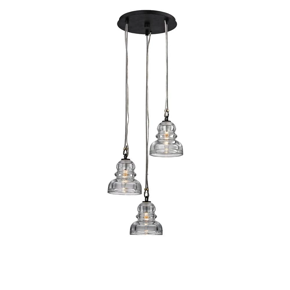 The weathered, urban elements of Menlo Park serve as an audacious ode to the Industrial Age. Capturing both contemporary and rustic aesthetics, Menlo Park is suspended by stainless steel and solid brass turnbuckle-style cables, and a circular hand-worked iron base in old silver. Historic pressed glass insulators function to complement the early electric style lamps.