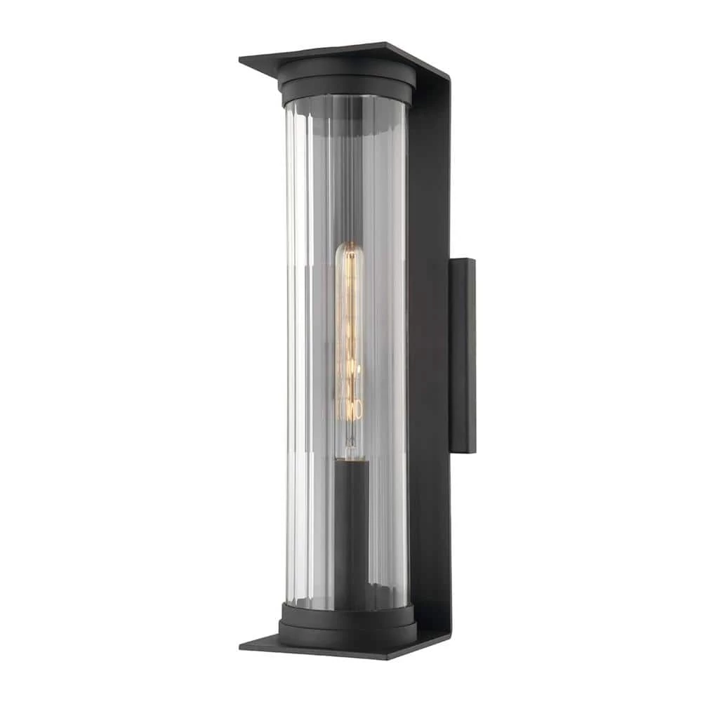 This beautifully simple fixture features a clear, ribbed-glass shade that rests between round end caps and a rectangular backplate. The long, slender design has a modern feel that works well in any style home. Extremely versatile, Presley can be used indoors or out and comes in 3 sizes to fit any space.